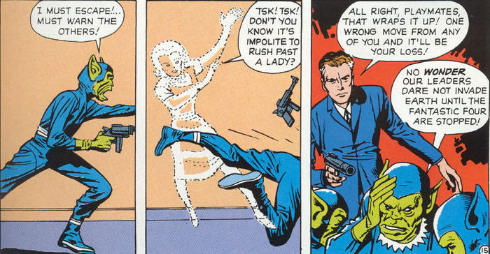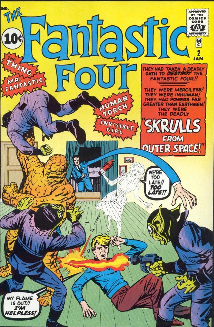 Уже в следующем выпуске, Fantastic Four #2, на сцену выходят Скруллы – зеленокожие пришельцы, которые ещё не раз подпортят нервы всему миру. Понимая, что мир защищает Фантастическая Четвёрка, скруллы решают её дискредитировать – и творят безобразия, превратившись в участников Четвёрки. Фантастическая Четвёрка разом объявляется врагами народа – но Рид Ричардс намерен очистить репутацию своих друзей. А для этого скруллов нужно перехитрить. Четвёрка похищает Скруллов, Рид и Джонни прикидываются скруллами (мы не люди, нам типа просто лень обратно в наш истинный зелёный облик превращаться, точно-точно) и проникают на главный корабль скрулльской армии, после чего показывают генералу скруллов картинки из монстрячих комиксов (настоящих, кстати, они тоже будут в этой рубрике в будущем) и убеждают, что это всё правда