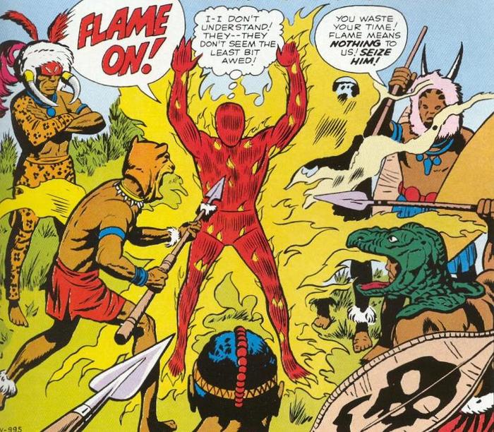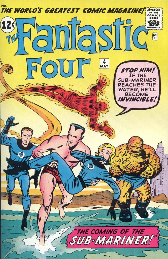 Ну куда же супергероика без любовного треугольника? Именно он (а также полуголый заносчивый аристократ) станет темой выпуска Fantastic Four #4 за май 1962 г. Но начинается всё с того, что Джонни-Факел чуть не погибает от рук разъярённого Бена Гримма (который пришёл набить несносному мальцу рожу, а Джонни не мог воспламениться, потому что стычка произошла в гараже и вокруг было много канистр с бензином). Кое-как свалив от Бена (который внезапно временно превратился в человека – и тут же обратно в Нечто), Джонни заглянул в бар – и встретил там бомжа, подозрительно похожего на того самого Нэмора, принца Атлантиды, о котором он читал в комиксах 1940-х (мы вставили тебе комиксы в комиксы, чтобы ты знакомился с комиксами, пока погружаешься в комиксы).