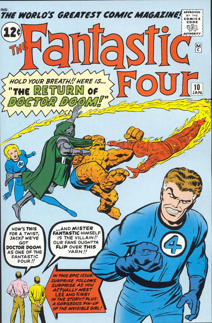 А завершит сегодняшнюю подборку, вполне ожидаемо, выпуск Fantastic Four #10, в котором можно встретить не только Доктора Дума – но и создателей комикса, Стэна Ли и Джека Кирби. Доктор Дум вернулся из своей увлекательной путёвки по космосу – и взял в заложники Стэна Ли и Джека Кирби (соответственно, писателя и художника, которым Четвёрка позволила рисовать комиксы по мотивам своих приключений), угрожая показать им своё жуткое лицо, если они немедленно не заманят Фантастическую Четвёрку в ловушку (ппц угроза, правда? Пугливые тогда были люди…). Рид прибывает на помощь первым – и Доктор Дум активирует свой убер-девайс и беспалевно меняется с Ридом телами.