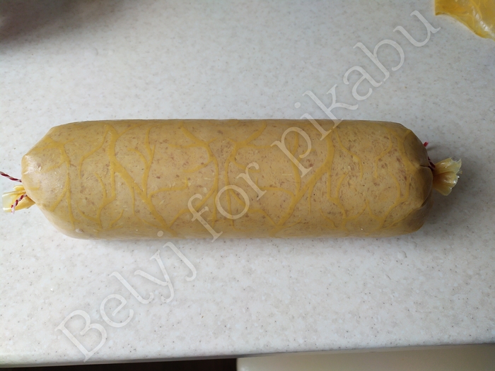 Теперь наша колбаса готова к употреблению. Получилось очень вкусно и сочно. Рекомендую всем к повторению. Единственный косячёк с видом на срезе, техника слегка не выдержала нагрузки, но зато мы имеем такой любопытный рисунок :)
