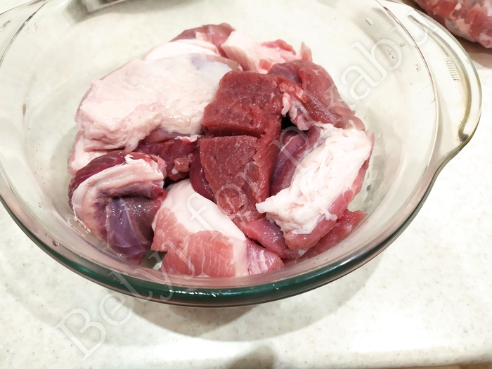 Говядину и свинину нарезаем кусками под мясорубку и убираем в морозилку на часик. Туда же убираем и сливки.