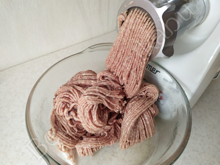 Подмороженное мясо прокручиваем на мясорубке с решеткой диаметром отверстий 4-5мм. Далее этот же фарш пропускаем через решетку 2-3мм.