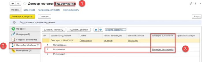 Проверка задается для Вида документа, в настройки обработки на нужном этапе: