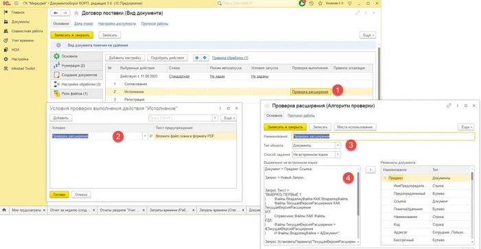 Задача с проверкой на расширение вложения решается легко, без доработки системы, но с написанием небольшого кода и вставки кода на этап проверки документа. Подробности как это сделать я изложил в видео.