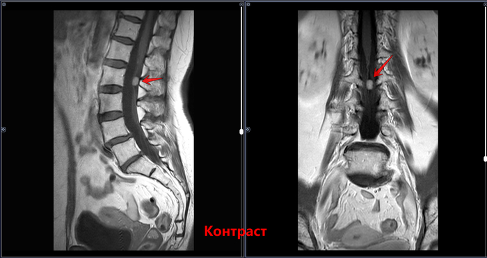 Интрадурально на уровне тела L2 позвонка визуализируется патологическое образование, овальной формы, с четкими ровными контурами, неоднородной структуры, характеризующееся преимущественно изогиперинтенсивным МР-сигналом на Т2-ВИ и изо- на Т1-ВИ. После внутривенного введения парамагнитного контрастного вещества отмечается его равномерное накопление образованием, размером до 13х8х7 мм . Других участков патологического накопления не определяется .Определяется смещение тела L4 позвонка кпереди относительно тела L5 позвонка на 3,5 мм. В L4-L5 определяется дорзальная протрузия межпозвонкового диска размером 2.6мм. В L5-S1 определяется дорзальная левосторонняя фораменальная протрузия диска размером 3 мм. Дегенеративно-дистрофические изменения.