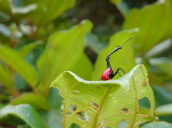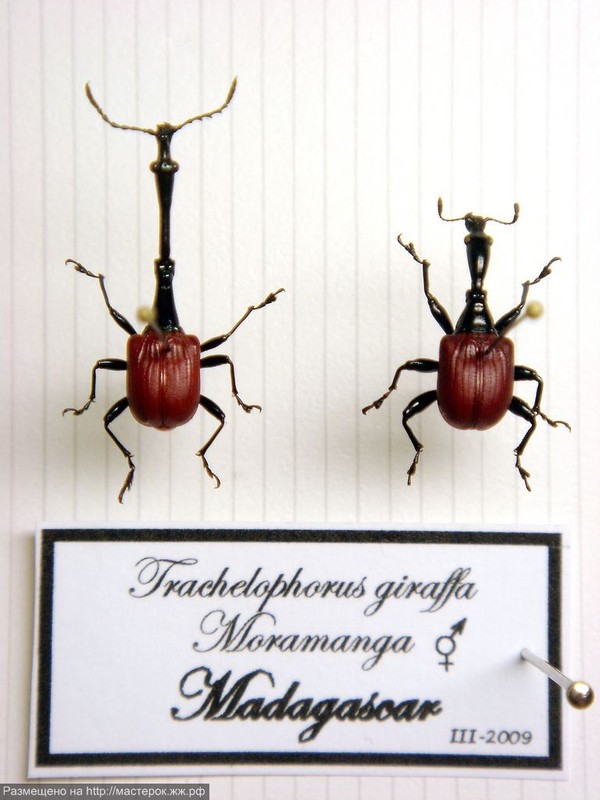 Свое название долгоносик-жираф получил из-за очень длинной шеи, которая иногда превышает длину тела жука. Проживает сие творение природы исключительно на о. Мадагаскар, в густых лесах национального парка Раномафана.