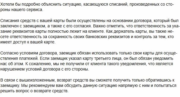 Короче суть: с заёмщиком договор, ответственность на нём, зафиксировали! Заёмщик нарушил условия договора, но списали деньги с меня. Деньги вы можете забрать только у заёмщика! ЕКАПУСТА ВЫ НЕ ОХУЕЛИ ТАМ?