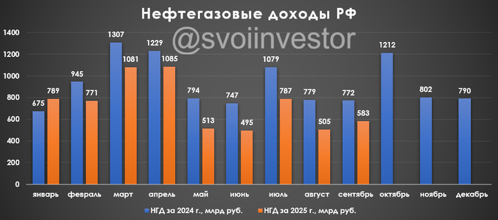 🛢️ По данным Минфина, НГД в сентябре 2025 г. составили 582,5₽ млрд (-24,5% г/г), месяцем ранее — 505₽ млрд (-35,1% г/г). Нефтегазовые доходы продолжают снижаться по отношению к прошлому году, всё из-за укрепления ₽, январских санкций, пошлин и снижения цены на сырьё (средний курс $ в сентябре 2024 г. — 91,2₽, цена Urals — 63,57$). Средний курс $ в сентябре 2025 г. составил 83₽ (в августе — 80,1₽), средняя же цена Urals снизилась до 56,82$ за баррель по данным МИНЭК (в августе — 57,55$), как итог цена за бочку в сентябре была равна ~4716₽ (в августе — 4610₽). С новыми правками по бюджету средний прогнозный курс $ за 2025 г. снизился с 96,5 до 94,3₽, цена Urals сократилась с 69,7 до 56$, августовские поступления для бюджета катастрофически малы. Рассмотрим полноценно отчёт: