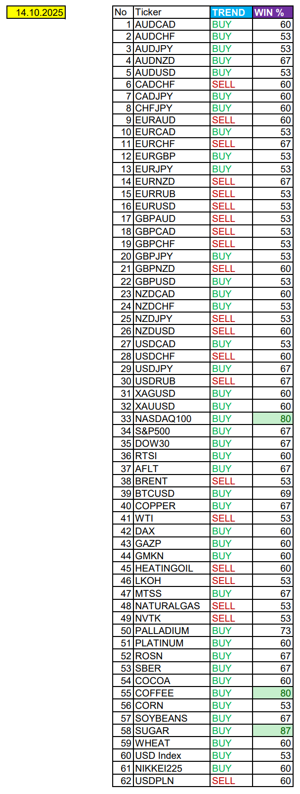 Очередные сезонные тенденции на среду 15 октября 2025 по основным мажорам финансовых рынков.