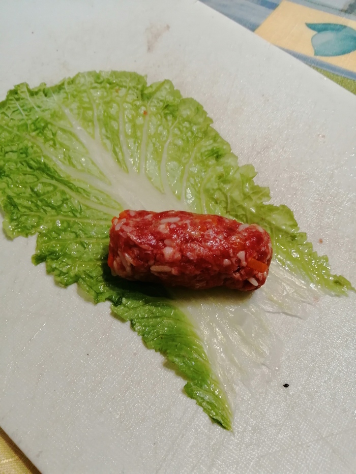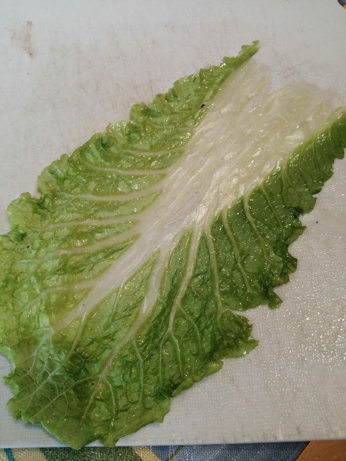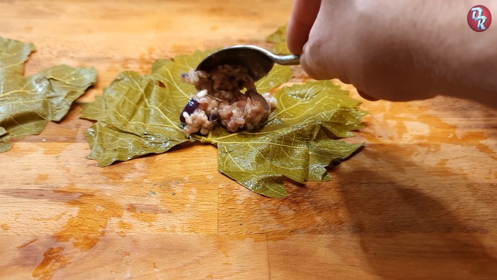 Итак, сначала мы закрываем фарш нижней частью виноградного листа.