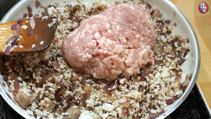 Все ингредиенты (кроме листьев, естественно) складываем в чашу и хорошенько вымешиваем фарш. Ещё раз повторюсь - солим немного, не забываем, что виноградные листья тоже солёные.