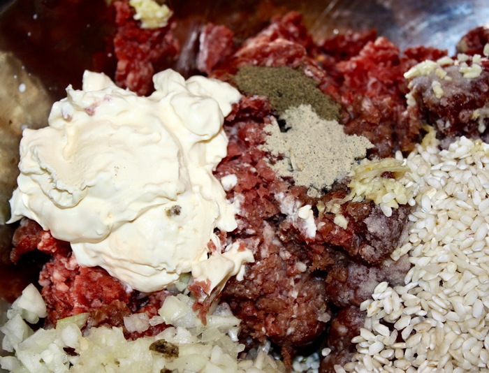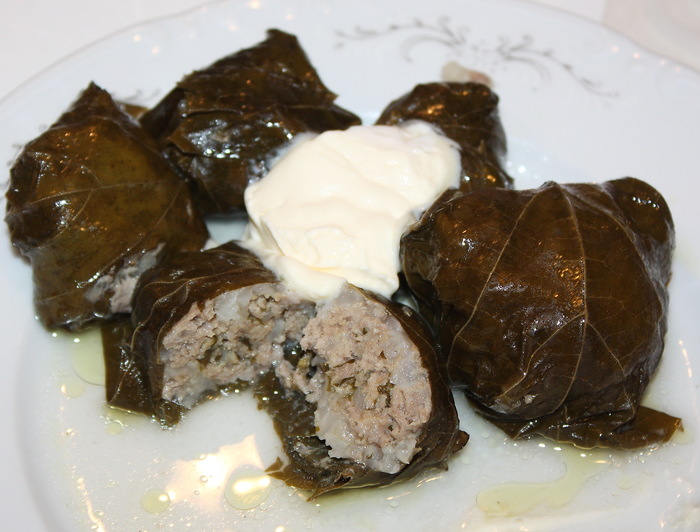 А пока листья лежат в кипятке, займемся фаршем. Перекрученную на мясорубке, но через крупную решетку обязательно, баранину посолим, сдобрим перцами, черным и белым. Добавим в фарш сметаны и немного воды, для сочности.