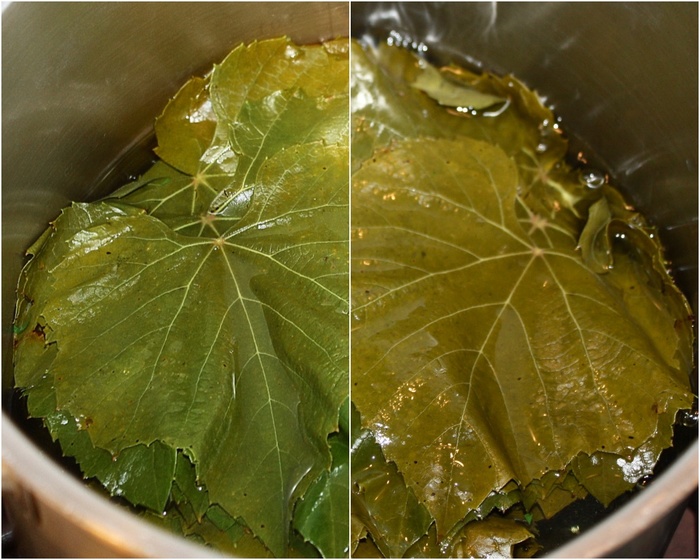 Потом сложенные в кастрюлю листья надо залить кипятком. Полностью. Чтобы листья слегка запарились и помягчели.