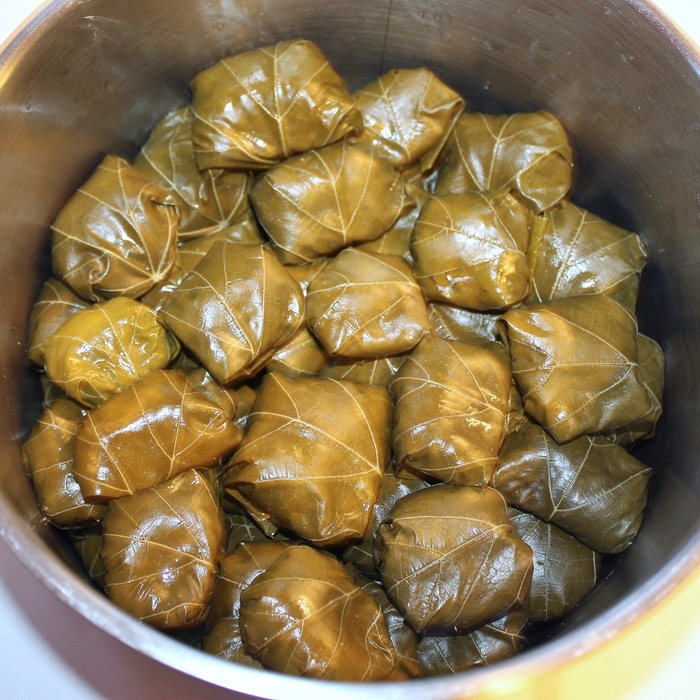 А потом укладываем готовые долмушечки в кастрюлю. Плотно надо уложить. Без фанатизма, но все-таки плотно.
