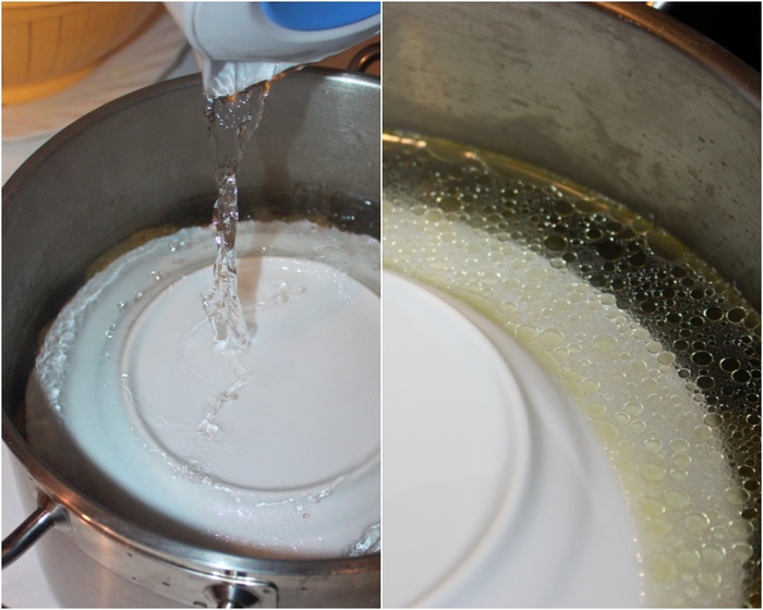 Сверху надо положить тарелку и залить водой. Чтобы вода покрывала тарелку сантиметров на «около пяти». Тарелка она…, если накипь появится, то накипь эта вся будет поверх тарелки. Это раз. И два – долмушечки окажутся все под тарелкой, т.е. внутри воды и не будут болтаться, как, например, пельмени. Им это не надо.
