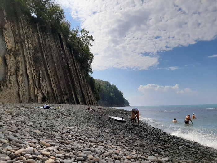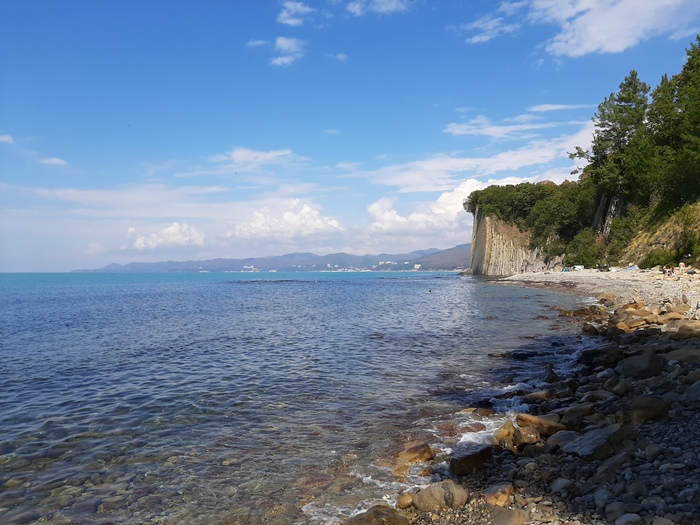 Если с нее спуститься с одной стороны можно выйти на пляж с плитами, где мелко, много водорослей и ужасный спуск, а с другой (в сторону Туапсе) галечный пляж, с нормальный глубиной и чистейшей водой.