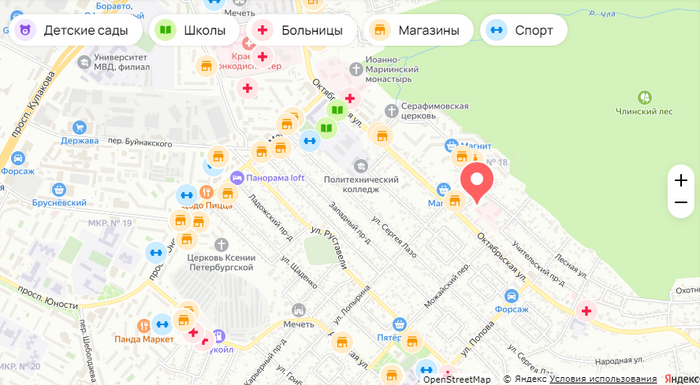 Интерактивная карта инфраструктуры доступна по ссылке. Карта подскажет вам, где находятся интересующие вас места: магазины, остановки, поликлиники, сады, школы, бульвары и парки, а также укажет расстояние до центра. Вы можете использовать функцию просмотра панорамы улиц в Яндекс.Картах, чтобы увидеть реальную обстановку.