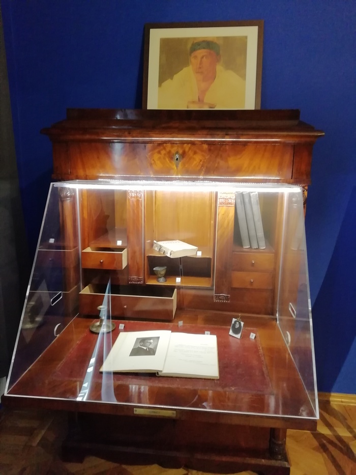 Мы уже были на втором этаже - видели кабинет Булгакова, его личные вещи, включая знаменитую зеленую лампу, когда Маргарита решила пустить нас все-таки в закрытую комнату. Дверь заскрипела и мы вошли. Ленка толкала меня в спину и я сопротивлялся, но шел первым, образуя острый угол нашей компании. Хозяйка зашла первой и остановилась около стола. Кажется он был круглый. Комната маленькая, тесная и без окон. Честно, не помню что она рассказывала, но явно что-то интересное. На столе разбросаны песочные часы, шкатулка, старые открытки, криповая игрушка, ручка, принадлежащая Михаилу Афанасьевича и еще много мелочей. Напротив стола старинное зеркало в котором отражались мы, женщина-экскурсовод и естественно стол.