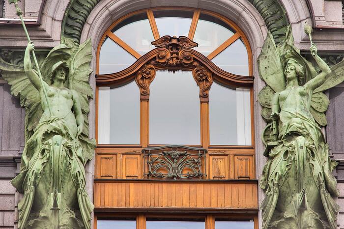 В отделке здания использовались текучие, плавные линии, присущие стилю ар-нуво. Фасад украсили бронзовые скульптуры валькирий авторства Амандуса Адамсона. Но, пожалуй, самый узнаваемый элемент дома – стеклянная башенка с глобусом, у подножия которой распростер крылья орел, созданный Александром Обером. В вечернее время башенка и тогда, и сейчас подсвечивается и привлекает внимание горожан.