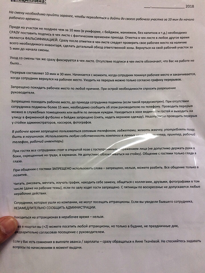 Когда нет посетителей (да, бывает и такое), пользоваться какими-либо гаджетами строго запрещается (книга, планшет, телефон). То есть, чтобы не помереть со скуки в спокойные дни, вам нужно либо покупать книги, либо записываться в библиотеку, чтобы носить макулатуру с собой. Ну, либо сидеть и деградировать. Так и хочется приписать им слоган «Спасём леса вместе!» и «Добро пожаловать в двадцать первый век». Но всё же стоит отдать должное: разрешается читать/рисовать на бумажечке, если перед носом нет клиентов. Назовём это «разрешением с барского плеча».