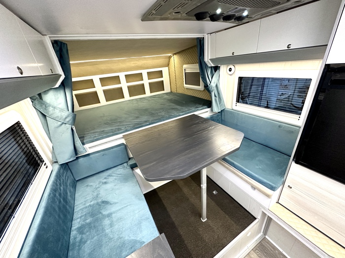 Столовая. Два дивана по 1100 мм шириной напротив друг друга. Под ними ящики-рундуки. Размеры ящиков 1100*500*500 мм. И кстати весь пол в модуле двойной. Высота "погреба" 300 мм и там помещаются 200 литров воду, и 400 а/ч литий аккумов. Это к разговору и вопросам про ЦТ. У входа полукруглый шкаф для верхней одежды и шкаф для обуви. Так же небольшой шкаф для другой одежды в виде полок. Напротив шкафа есть еще и крючки для ветровок и легких курток.