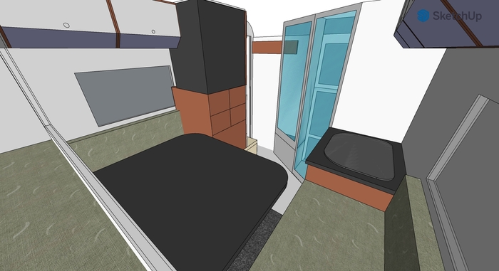 Ну конечно самое важной - душ. На верхней картинке видно, что он больше чем на прощлых моделях. Его размеры 1100*1000 мм. Установлен кассетный биотуалет с внешней кассетой, раковина и кроме люка на потолке решили поставить еще одно окно. В душ отдельно подведет рукав отопителя, что сделает душ, при необходимости, эффективным сушильным шкафом.