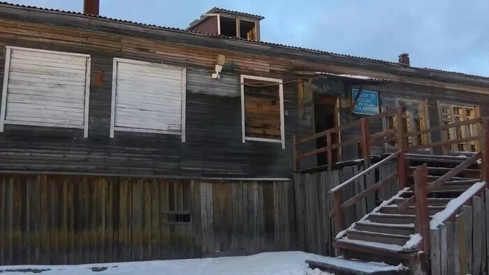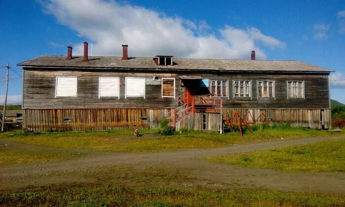 Стоит брошенный с начала 90-х. Четырехэтажка строилась по спецпроекту, она пережила несколько сильных землетрясений, а прогрессивные реформы, когда в селе месяцами не было света и воды, нет. Жильцы, что не могли уехать на материк, перешли в дома из бруса где есть печки.