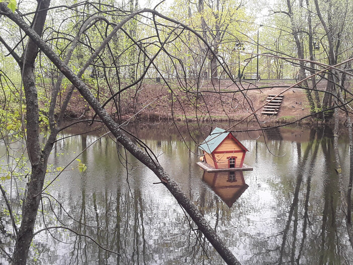 Этот домик для уточки с Воробьёвых гор образует вместе со своим отражением эдакую островерхую восьмёрку.