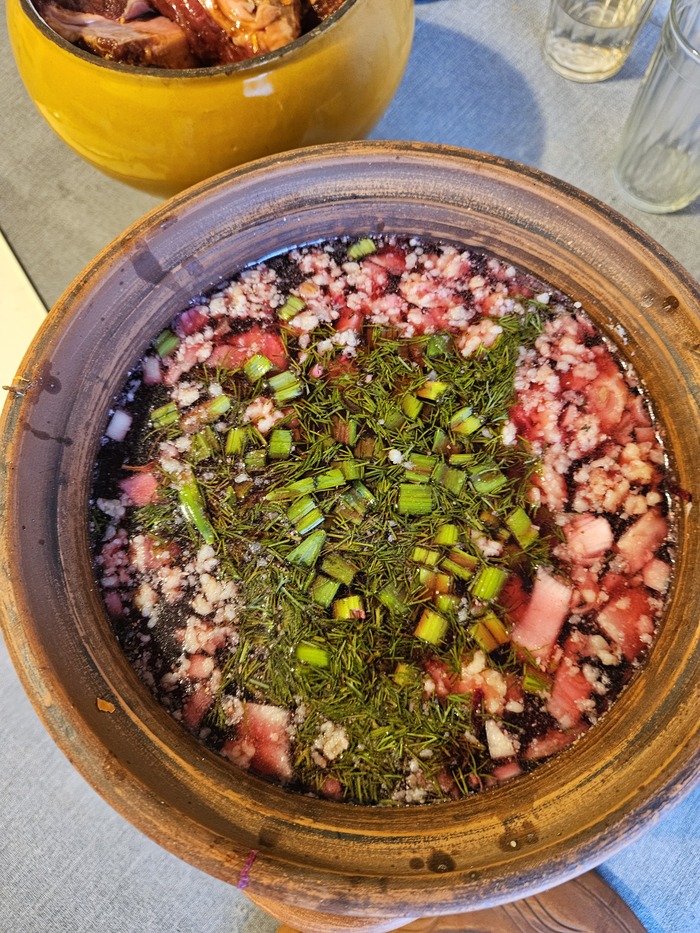 Еще был суп. Не, не так. СУП. Я разжилась еще одним прекрасным горшком. В этот раз керамическим от завода гжель. И была у меня в заначке кость. а, вернее, тб сустав) Решила я сначала бульон сделать на его основе, а потом уже суп заправлять (по вашим советам бросила неочищенную луковицу). А то этот монстр много места занимал в горшке. Простоял мой бульон в горячей печи ночь, а с утра я имела....холодец. Хоть и печалилась я, что не успеваю в этот раз сделать холодец по рецепту из комментариев, а он взял и сам получился) Заправила я потом суп картошкой, моркошкой, свеклой и прочей дребеденью. Получился густой, наваристый. Зимой после холода - самое то.