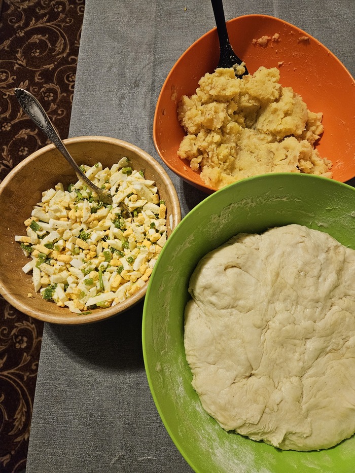 Ну и под конец я взялась за пироги - мужу захотелось. случились пироги с луком и яйцом и картошкой с луком, ибо к тому моменту ничего больше в холодильнике не осталось)