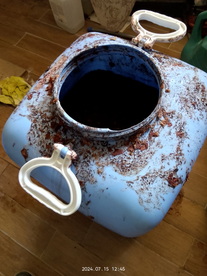 Перед началом, я приобрёл 40л. бак из пищевого пластика и эмалированную кастрюлю такого же объёма. Виноград с грозди был весь снят, перебран и помещён в пластиковую ёмкость для бурного брожения. Давил виноград руками, долго и упорно, после чего руки весь вечер щипали, выкрасились в розовый цвет. Заполненная ёмкость была помещена в тёплое место с температурой 22-24С. Бурное брожение началось примерно на второй или третий день. Виноградная масса тщательно перемешивалась (сбивал шапку) 3-5 раз в сутки, выдерживал не более 7 дней. Пока виноградная микрофлора делала своё дело, я приобрёл стеклянную 20л. бутыль, в которую и перелил молодое вино, снятое с мезги. В бутыль был добавлен так же сахар, пропорцию сейчас уже не вспомню (примерно 20-25%), на горлышко одета медицинская перчатка. Это была первая сахарная ошибка, к тому же я поставил бутыль в более тёплое место. За ночь, виноградная масса поднялась, разорвала перчатку и вышла наружу. Активное брожение началось вновь, вино набирало свои градусы. Почему я тогда решил добавить сахар в тот момент, не вспомню уже, но в планах было сделать полусладкое вино. Со второго брожения вино было снято примерно через 21 день, когда перчатка послушно склонила свои пальцы. В итоге получилось великолепное полусладкое вино, но содержание на выходе сахара и градуса уже не вспомню. К нам в гости приезжали друзья, они любители и ценители красных вин, которых порадовало это вино.
