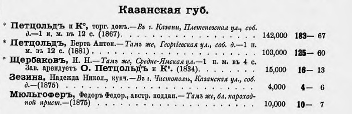 Петцольдъ и Ко, тор. домъ. Екатерининская, 5 ч. д. № 95, Плетеневская, №№ 1, 5 и 6.