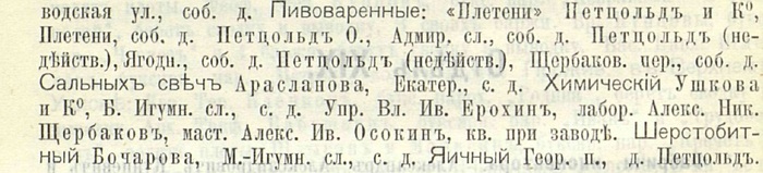 «Пивоваренное дело всецело находится въ рукахъ выходцевъ-немцевъ Петцольдъ, на заводахъ, имъ принадлежащихъ, пива ежегодно приготовляется до 400000 ведръ».