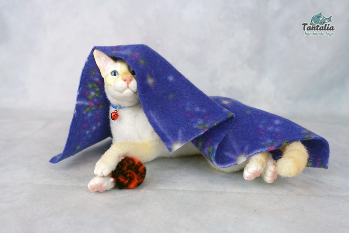 Кот создан в смешанной технике - морда и лапы из запекаемо полимерной глины, глазки из стекла, внутри тела смешанный каркас - проволока плюс пластиковый скелет для кукол, а тело из искусственного меха, вручную окрашенного.