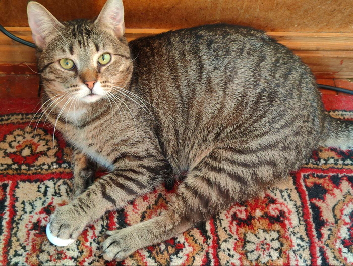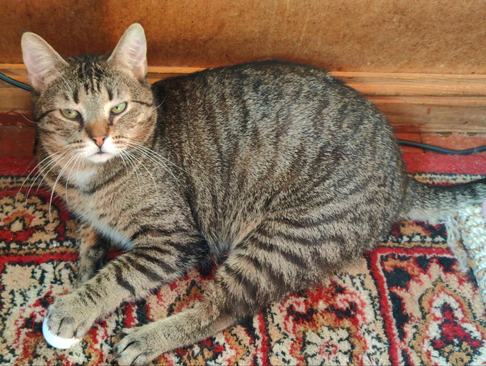 Полосаткин был самый пугливый из всех и самый худой. Сначала убегал от меня, прятался и не давала себя гладить. Но прошло время и он стал ласковый и толстый. Конечно, он и сейчас смотрит на меня с немым вопросом, когда я хочу погладить его по голове. Но так как кроме ласки он ничего не получает, он уже совсем раскрылся.