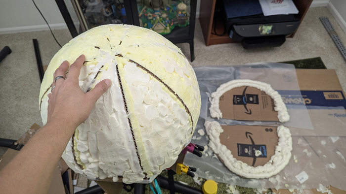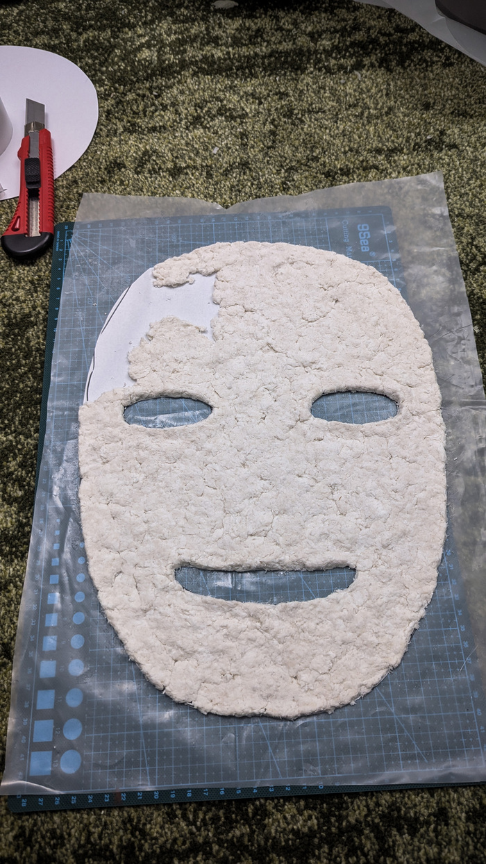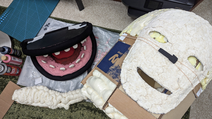 Немного фото процесса. Материалы простые - ткань, маска и зубы из папье-маше, голова из монтажной пены на картонном каркасе. Обрезки монтажной пены нахожу дома до сих пор, кстати.