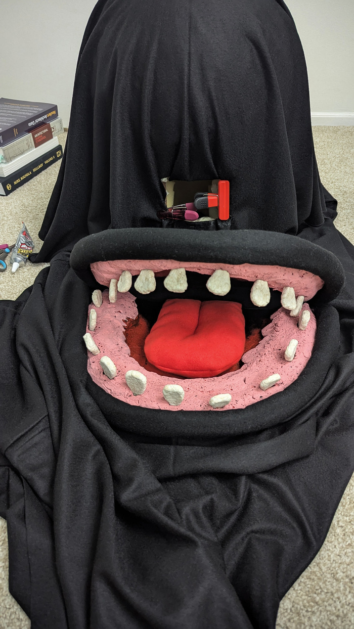 Главной задачей было сделать открывающийся рот, но чтобы он был спрятан. Рот контролируется рукой изнутри, поэтому правая рука - муляж.