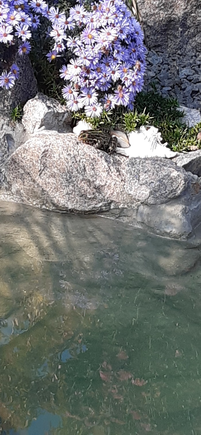 Бетон, берега гранит,объем 4,5 куба, золотые рыбки, существует уже 10 лет, весной приходят метать икру земляные жабы, птицы летом прилетают попить водички, у нас очень засушливо летом, вот и пришла идея сделать прудик.