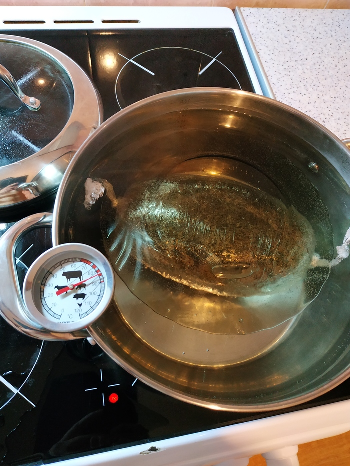 После перерыва запускаем процесс варки. Часика на 3. Лучше начать ближе к вечеру, т.к. после варки колбаска будет ночь стоять под прессом.