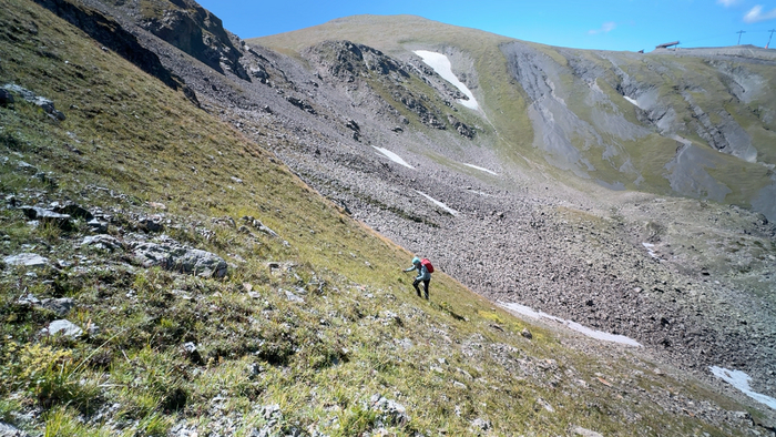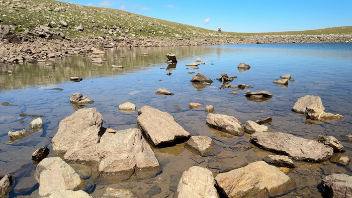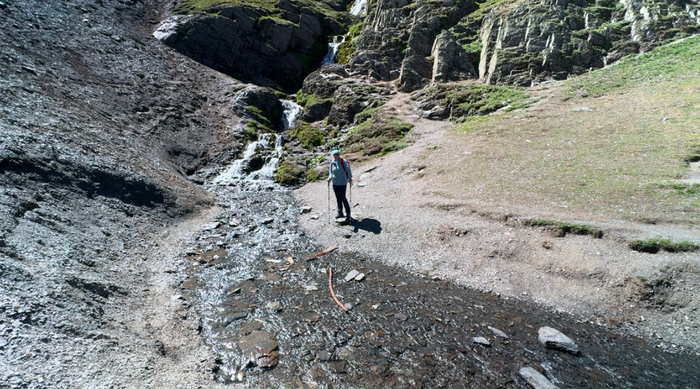 После подъема выдался милосердный пологий участок вдоль ручья. Но, не успела я порадоваться, как ручей нырнул в крупные камни. Тут тропу мы потеряли, если честно. Как ни искали маркировку, не нашли. Скакали по камням. Вода на этом месте заканчивается. Мы пополнили запасы и подошли к перевалу.