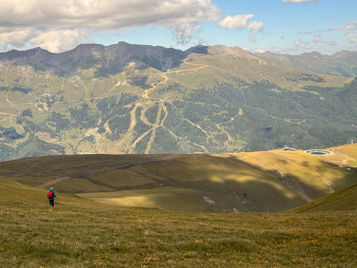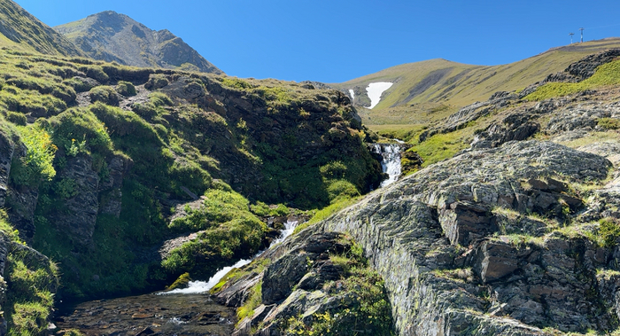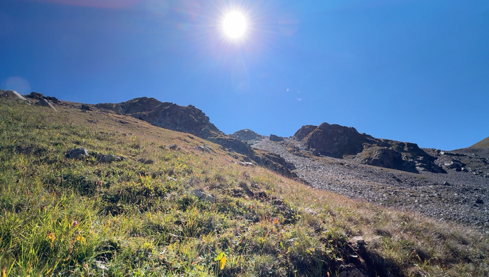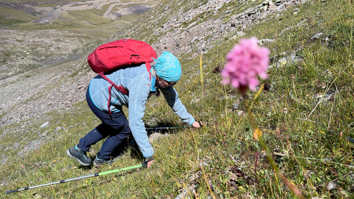 Маркированная тропа резко уходит вверх по правому берегу ручья. Набор высоты там приличный – сразу до 2400 м. Левый берег выглядел более пологим, пошли по нему: на правом надо было перелезать через большие камни. А по левому, земляному, видимо, водят лошадей: до перевала ты можешь доехать верхом. От поляны Таулу – 10 тысяч рублей в 2024 году. На этом участке вообще разброд и шатание: кто от водопада идет, кто откуда-то с соседней горы спускается, и троп – штук пять точно. Но есть направление, не заблудишься.