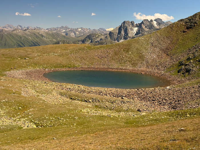 Озер в этом месте три. Ближайшее к перевалу – Большое Софийское. За ним, если стоять к перевалу спиной – Верхнее Софийское, черное и не такое красивое. А справа – Нижнее Софийское, поменьше, но тоже бирюзовое. Из Большого через него бежит и затем устремляется вниз, к Айматлы-Джагалы, ручей Кашха-Эчкичат.