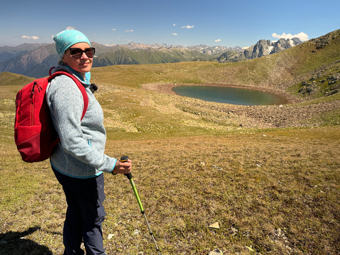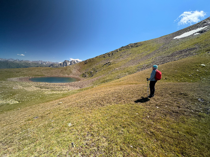 Допиваем воду, сидим, наслаждаемся видом. Камни, пики гор, снежники – и матовая бирюза Большого Софийского озера. Даже отсюда видно, что оно непрозрачное. На берегу отдыхают туристы – те, кто пришел раньше. Сюда есть трек одного дня: взойти, как мы, через Иркиз, спуститься через Айматлы-Джагалы. Но стартовать нужно не позднее 10.
