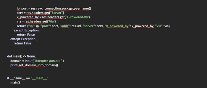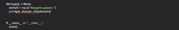 Ну и создадим функцию main, где и будем запрашивать у пользователя домен, отправлять его в функцию для получения информации и выводить на печать полученные в виде словаря данные.
