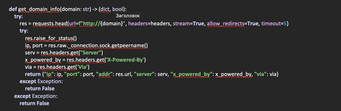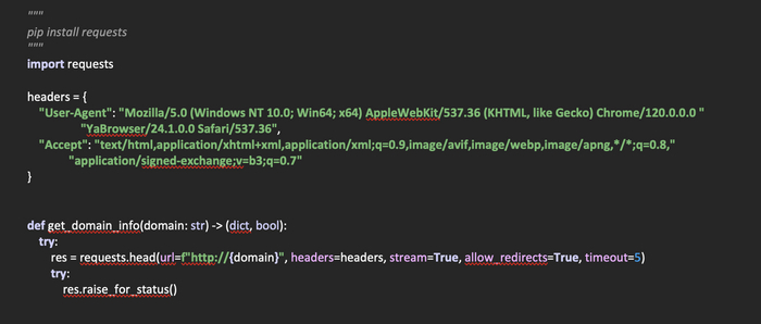 Создадим функцию get_domain_info(domain: str) -> (dict, bool), которая на входе будет получать домен, а возвращать заголовки отправленные сервером, а также ip-адрес домена.
