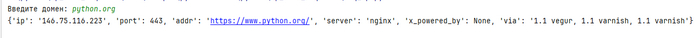 Протестируем написанный код и получим заголовки и ip-адрес для домена python.org.