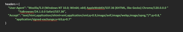 После этого создадим словарь с заголовками содержащими «User-Agent» и «Accept». Их мы будем передавать в запрос в качестве параметра, чтобы изменить стандартные заголовки отправляемые python.