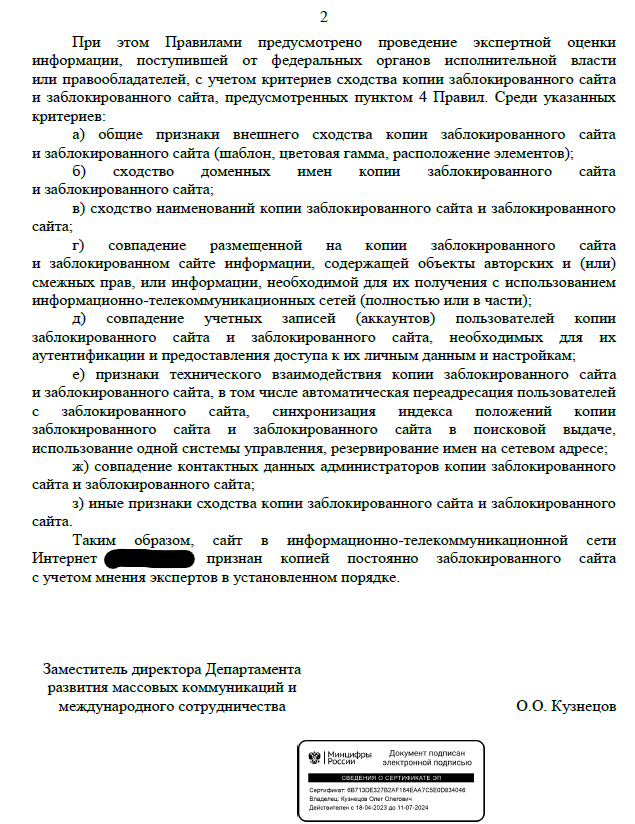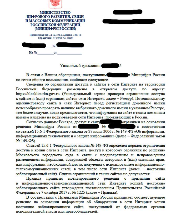 Сама тема поста: у меня есть хостинг, я зарегал домен, начал ставить на него сертификат и столкнулся с непонятной ошибкой. Регистратор ответил, что домен находится в реестре блокировки РКН. Я написал в РКН – они сослались на решение Минцифры. Минцифры в свою очередь ссылается на статью 15.6-1 ФЗ 149: домен заблокирован, потому что когда-то являлся зеркалом пиратского сайта. Сейчас приведу их ответы, а потом мои соображения.