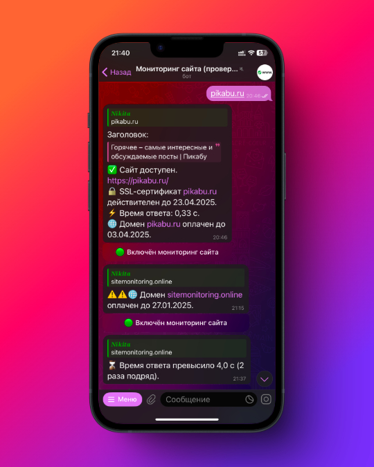 Бот каждые 5 минут проверяет порученный ему сайт: живой ли, какая реакция, какой заголовок страницы, куда ведёт переадресация, доколе действует домен и сертификат. Если произойдёт что-то важное — напишет.