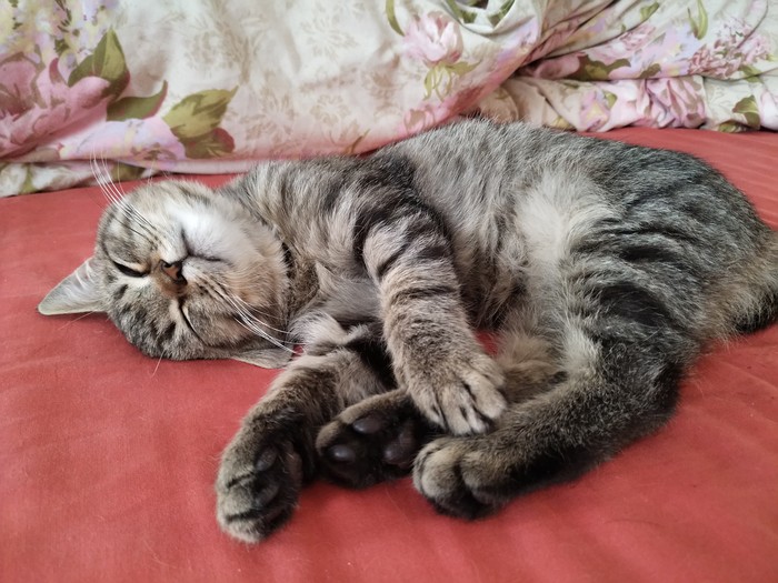 К ночи успокоился, пришёл и уснул на моей голове. На следующий день выкупали зверя, купили правильного корма, кот успокоился и впал в спячку, при этом при любом приближении к нему, начинал громко мурчать. Мы, конечно, были ми-ми-ми, очень впечатлены и довольны, котяра прикольный и видно, что с большим таким кошачьим сердцем. К купанию отнёсся философски, в лоток пошёл с первого раза, когтеточку воспринял как родную, плохих манер, типа лазанья по столам, не проявил.